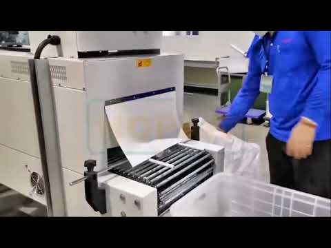 Products are wrapped in film as they pass through the machine, followed by heating to shrink the film and cooling to set the shape. The final packaged products are sturdy, visually appealing, and ideal for logistics and retail purposes.